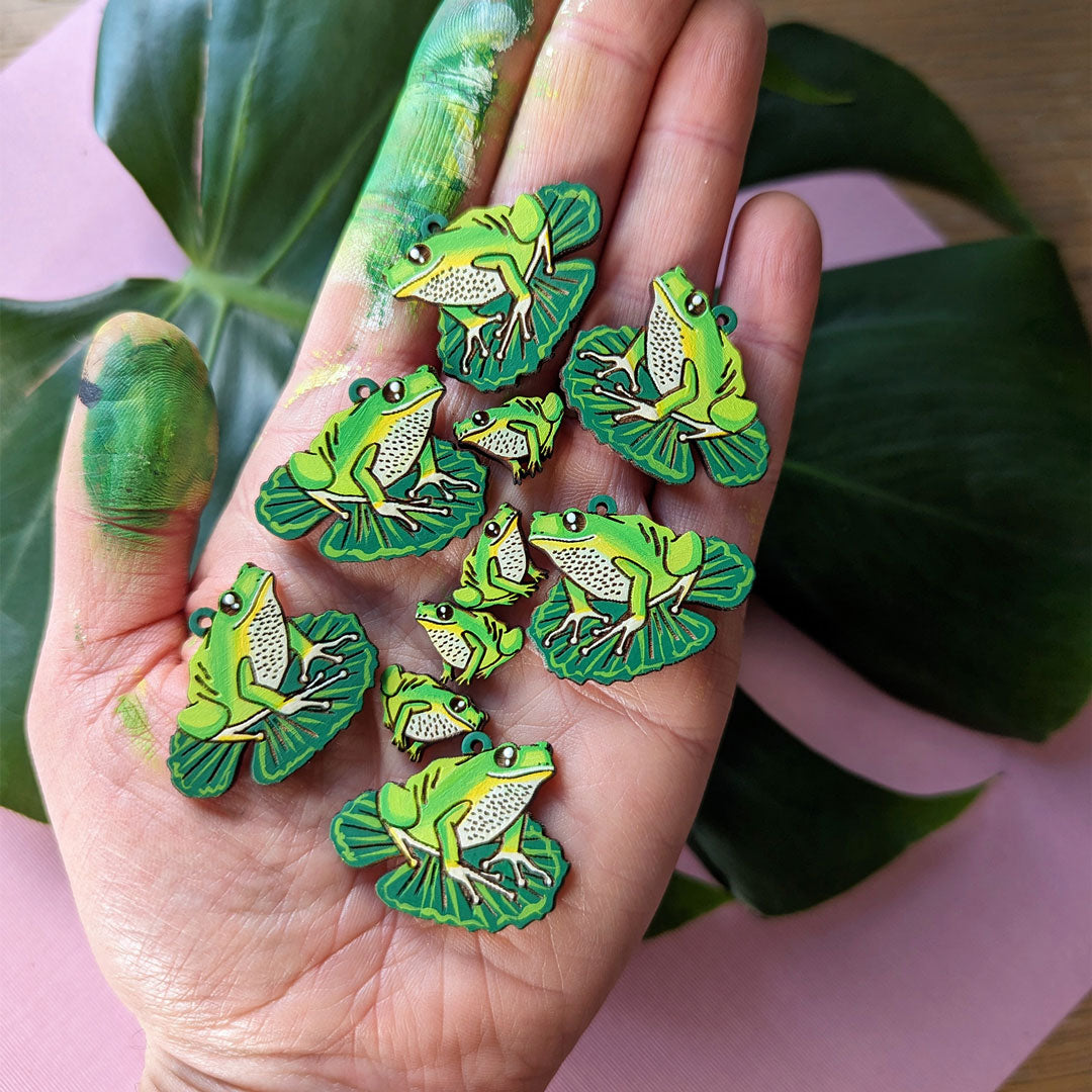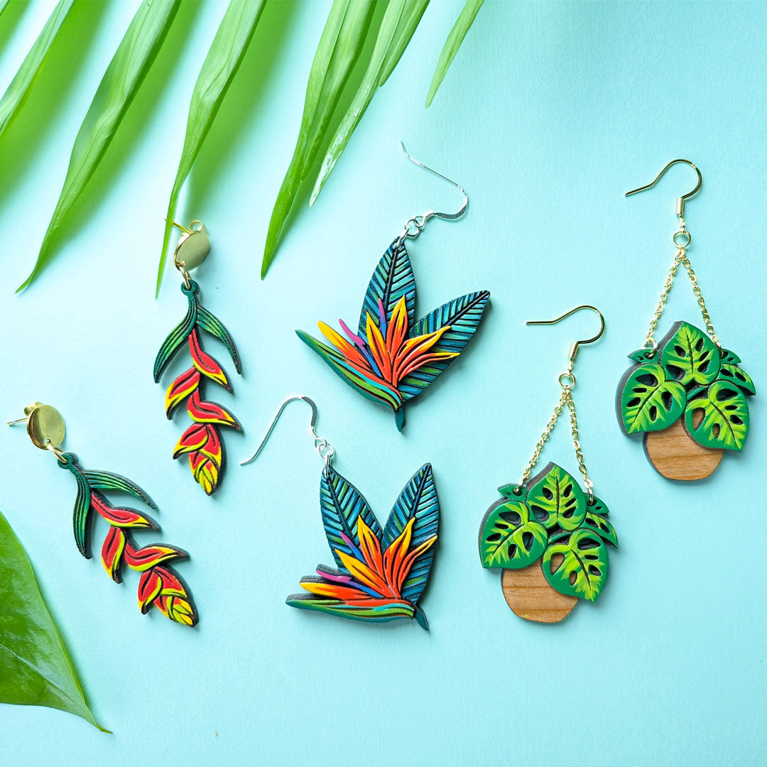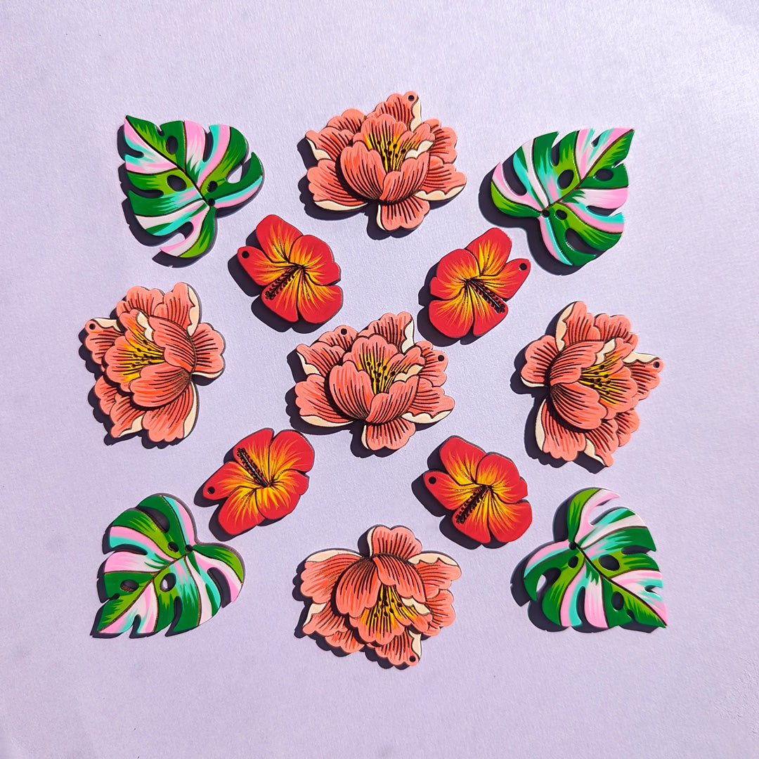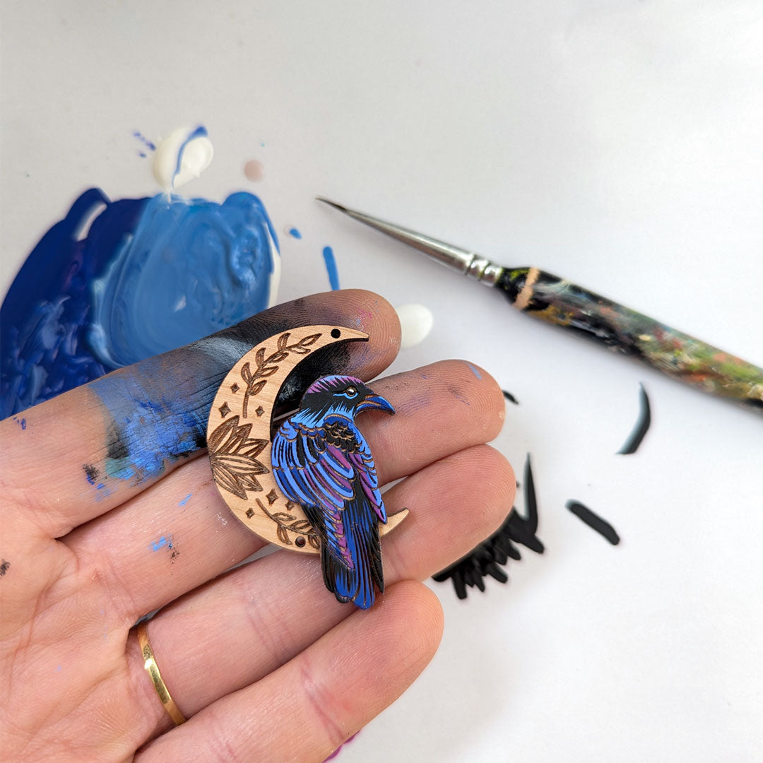 Each piece starts with an original digital illustration based on a plant or animal. These illustrations are laser-etched into cherry wood to create a painting canvas. In some cases, I layer multiple pieces of wood to create a 3D effect. I delicately paint each item to create a one-of-a-kind wearable work of art.